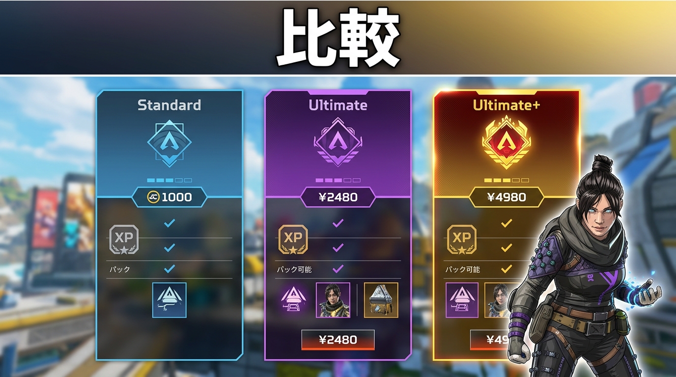 さらに、プレミアムバトルパスの中にも「プレミアム」「アルティメット」「アルティメット+」といった複数のティアが存在します。これらのティアは、単に価格が違うだけでなく、含まれる特典内容が大きく異なります。特に「アルティメット+」は、レベルスキップや全レジェンド解放といった、ゲームプレイを有利に進めるための特別なボーナスが付帯していることが多いです。